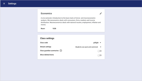 將Classroom的一般設定集中,課程管理的老師可以在同一個地方同時管理包含課程說明編輯、課程代碼、監護人摘要設定,還可以標示出教室的位置,也可以管理學生課程訊息串留言及張貼內容的權限。