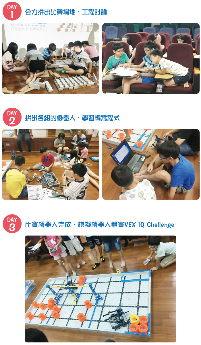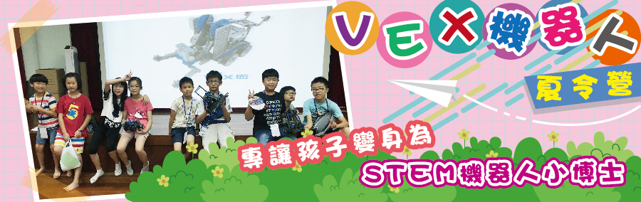 VEX機器人比賽是將STEM教育結合機器人的世界性比賽,為目前全世界最多人參與的機器人比賽,機器人使STEM與電腦科學變得有趣、有挑戰性,也大幅提升了學生的興趣及主動學習的動機,透過模擬機器人競賽VEX IQ Challenge,也進一步讓學員了解團隊如何準備VEX IQ機器人競賽活動,活動課程內容包含:了解比賽並規劃策略、設計機器人、編寫機器人程式及分組競賽等,以比賽為媒介讓孩子在實作中分工學習,並培養解決問題的能力。