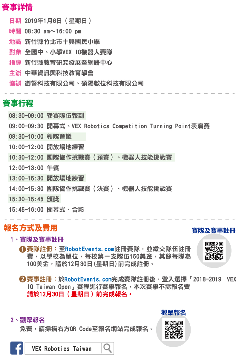 中華資訊與科技教育學會主辦,「2018-19VEX IQ Taiwan Open」將於2019年1月6號(星期日)在新竹縣十興國民小學開賽。本次活動為臺灣地區首次VEX IQ機器人賽事,VEX IQ為適用於中、小學STEM教育的教學型機器人,更為全球機器人教育與競賽的領頭羊以及金氏世界紀錄認證規模最龐大的機器人賽事。