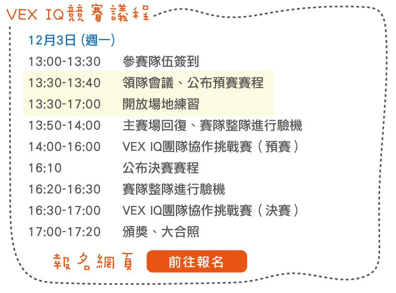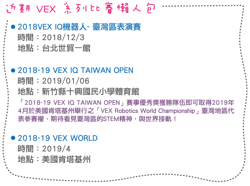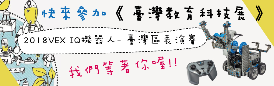 搭配展覽的系列活動,「2018VEX IQ機器人- 臺灣區表演賽」12/3將於展中開賽,此賽事為2019/01/06「2018-19 VEX IQ TAIWAN OPEN」的賽前賽,競賽規則與國際標準VEX IQ Challenge相同,並採用2018-19賽季VEX IQ Challenge Next Level賽事主題,此外,賽事資訊亦同步於全球賽事負責單位REC Foundation。歡迎學界及學校老師、家長、學生蒞臨體驗機器人競賽饗宴。