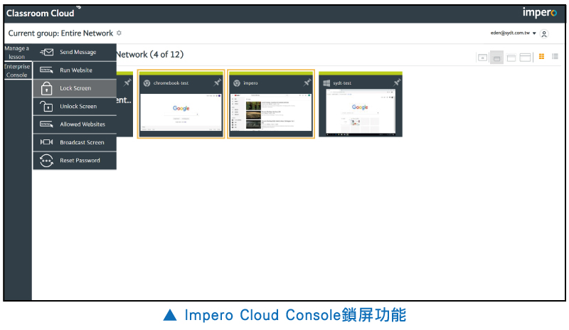 Impero Education Pro結合看課堂管理、網路管理及網路安全,是一款全方位解決方案,旨在協助教師解決課堂行動裝置教學的障礙、節省學校管理者管理學校硬體的時間效率,及提高學生利用網路學習時的安全性。它的功能包括:載具管理、程式部署、課堂管理、關鍵字主動監測等等。支援系統包括Windows、ChromeOS、MacOS等。