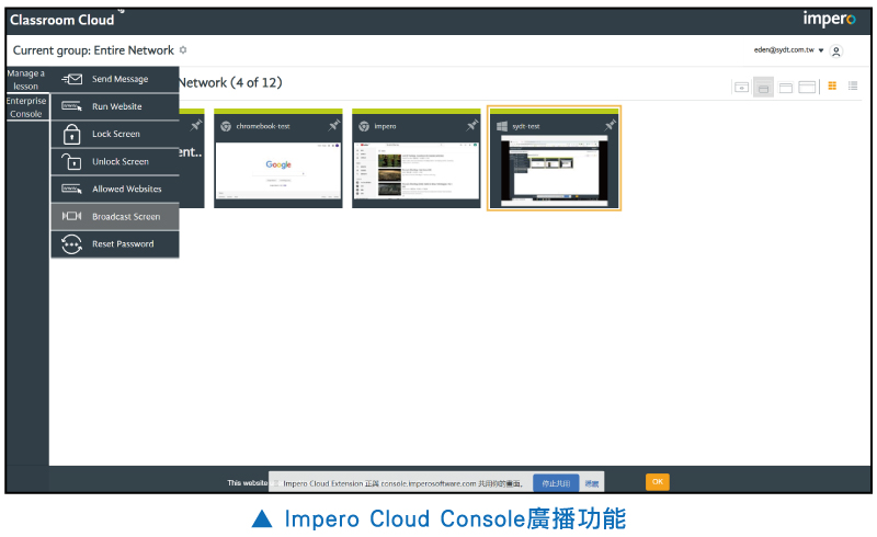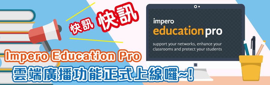 因應Chromebook的崛起和雲端技術的普及,Impero Education Pro自6.4版以來開發了基於雲端執行的管理平台——Cloud Console,這項新功能支援教師透過瀏覽器來存取教室管理功能,對學生進行諸如監視屏幕、鎖屏、對話等管理。在最新的7.2版本,雲端廣播功能也已正式上線,教師可以將自己的屏幕(無論是在Windows、Chromebook或是MacOS)投影至受監管的載具中,此外 簡單易用的操作界面也讓教師得以更聚焦在課堂教學上。同時 藉由Impero Education Pro對載具更深入且全面的支援,學校將能大幅提升行動裝置導入教學的優勢,並為學生提供安全的網路應用環境。