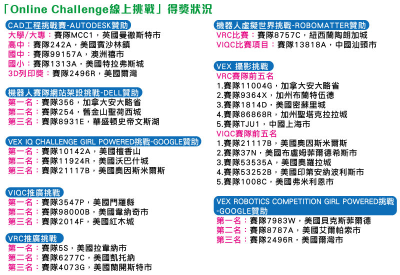VEX機器人世界賽的130個獎項當中,包含了隸屬於REC的另一項比賽「Online Challenge線上挑戰」的獎項,其贏家已於3月10日公布於線上挑戰頁面中,其中「Autodesk CAD工程挑戰賽」、「DELL機器人賽隊網站架設挑戰」、「ROBOMATTER機器人虛擬世界挑戰」、「GIRL POWERED挑戰」、「VEX推廣挑戰」得主皆會在世界賽露面受獎!