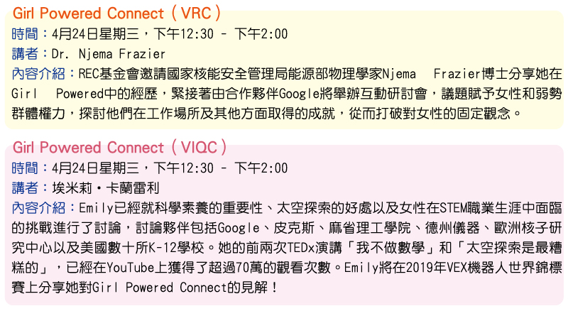 除了線上挑戰之外,VEX致力推動的Girl Powered也會於世界賽中以研討會的方式露面,將分別於VRC與VIQC兩項比賽的第一天推出,並由美國知名物理學家Njema Frazier博士以及知名科學節目製作人埃米莉•卡蘭雷利為主講人,將探討她們針對Girl Powered Connect的經驗與見解。