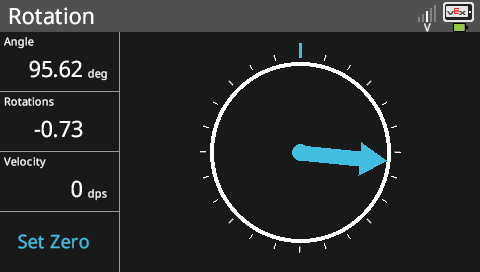 V5 Rotation Sensor(V5旋轉感測器)可測量軸的轉動角度、圈數、轉動速度。旋轉位置是從0°到360°測量的,精度為0.088。0°可透過V5數據機或者是透過編碼設置。轉動圈數是指正轉或者反轉的轉動圈數,並可依照專題需求重置為0。每次重新開機,轉動圈數即歸零重新計算。轉動速度以秒為單位計算。選轉感測器同時適用一般軸與強化軸。