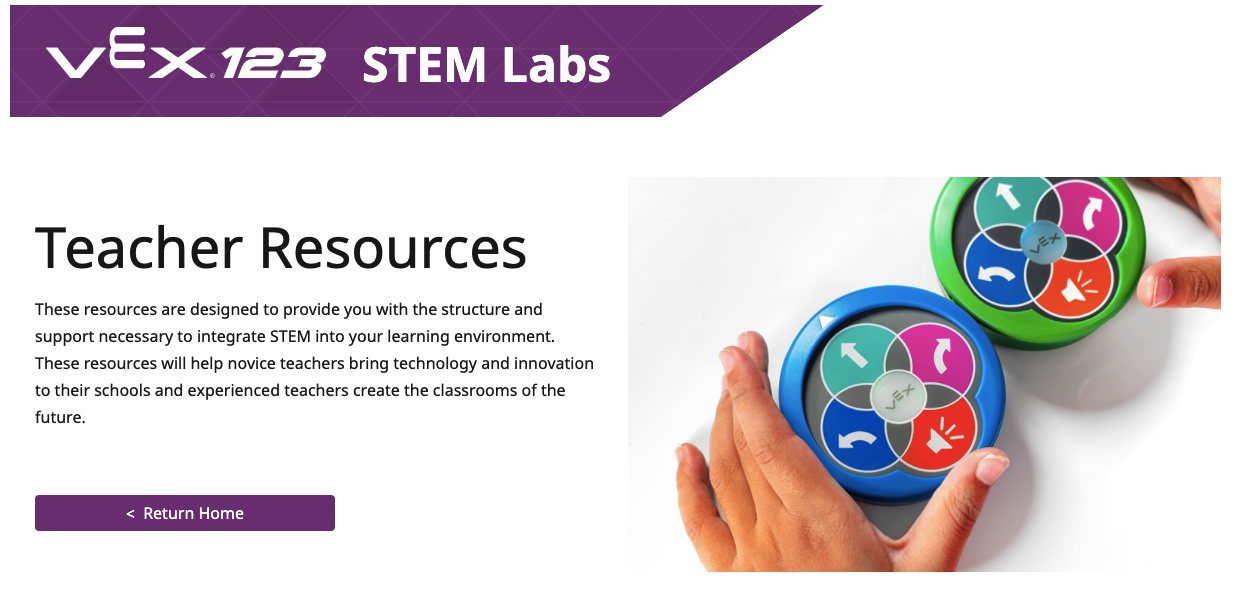 VEX 123 是互動機器人,原本只能在電腦裝置中學習的電腦運算思維,現在 VEX 123 機器人將電腦科學和電腦運算思維搬到現實生活中,讓學齡前到小二的小孩在手掌上把玩機器人的同時就能輕鬆學習程式概念。簡單地觸控方向按鈕就可以控制 VEX 123 機器人,這些方向鍵的序列的設計教導孩子基本的邏輯和解決問題的技能。VEX 123 為了搭配孩子的學習步調,準備兩個不同編程的學習與探索階段,使用 VEX 編碼板和編碼卡,孩子們可以學習如何藉由指令與機器人溝通,初步建立起程式編碼概念。此外,還可以透過 VEXcode 123 編程軟體來解鎖全部功能,VEXcode 適用於平板電腦,Chromebook,Mac 和 Windows 設備。STEM Labs 中也提供配套教學,讓家長與教師在引導的過程中有趣地吸引孩子的目光。