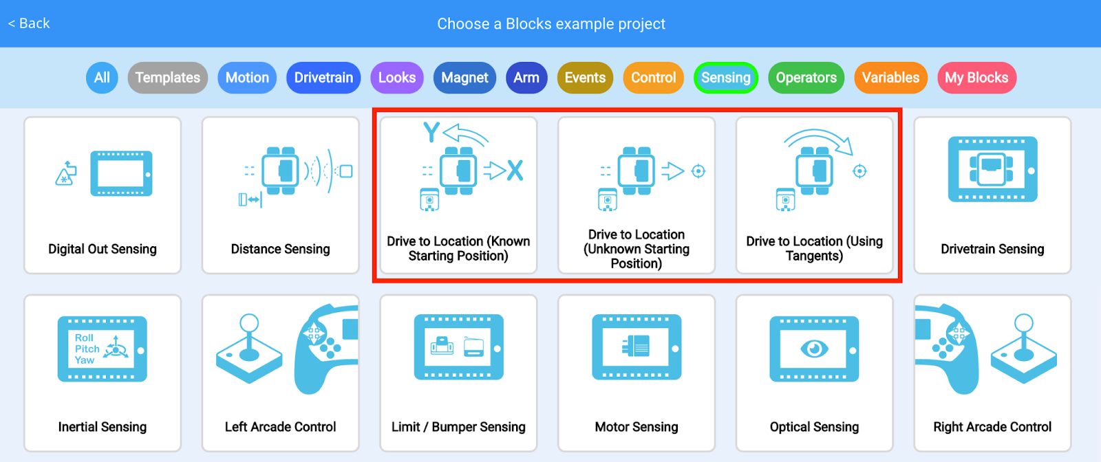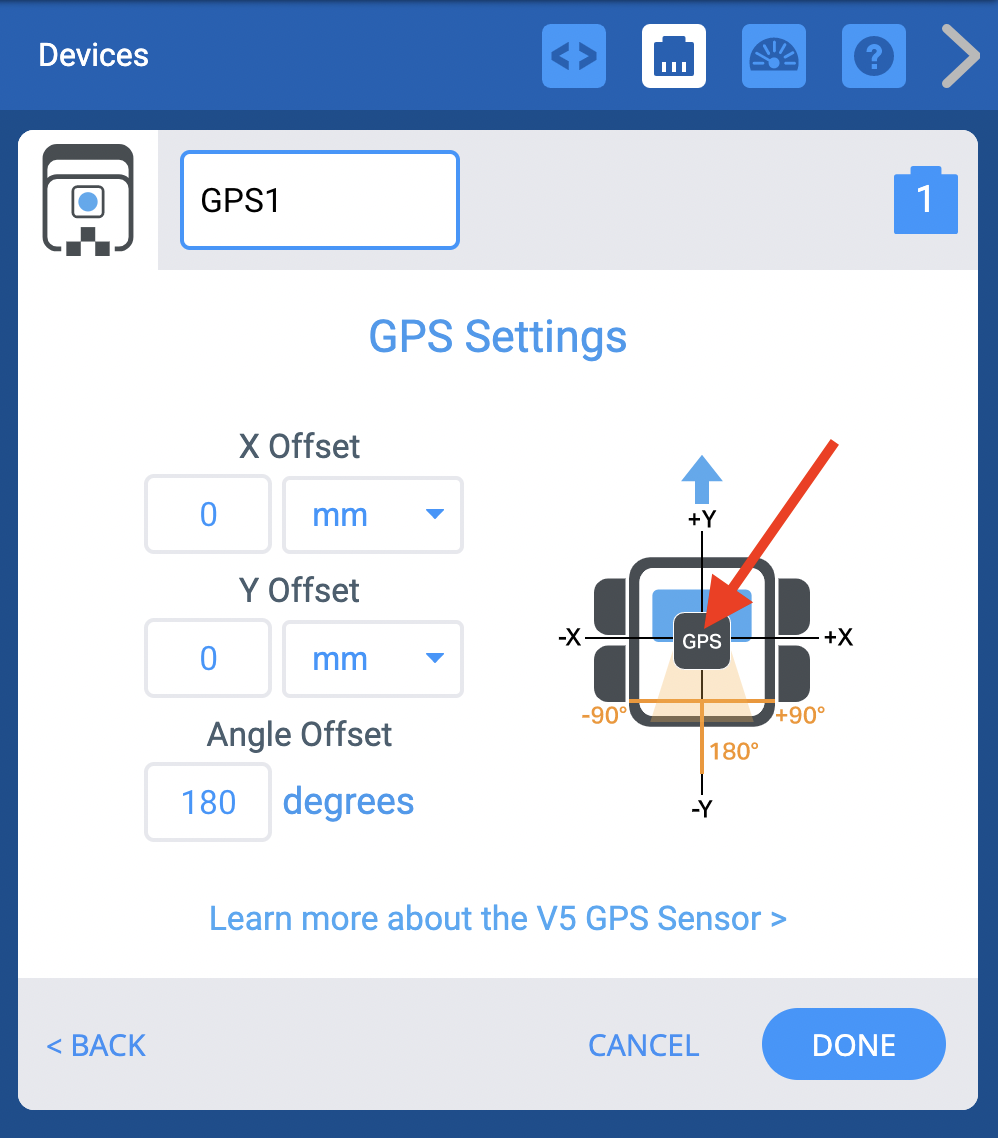 GPS Sensor 將場地中央預設為座標原點 (0,0) 來定位,不過,如果 GPS Sensor 未安裝在機器人的旋轉中心點上,賽隊則可利用 GPS 配置設定 X、Y 偏移值,重新將 GPS Sensor 校正回機器人的旋轉中心。當開始使用 GPS Sensor 並想探索不同的機器人行為,Example projects 將是一個很好的資源,使用者可以藉此觀察 VEXcode V5 中與 GPS Sensor 相關的不同程式下的應用情況。
