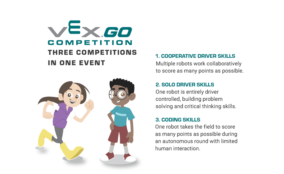 本次發布的 VEX GO 競賽套件包括 4 種主題,依照難度排序,分別為火星數學探險(Mars Math Expedition)、鄉村工程建設(Village Engineering Construction)、海洋科學探索(Ocean Science Exploration)、城市科技重建(City Technology Rebuild),每種主題還可以變化為 4 種競賽階段,賽隊學生透過完成主題任務來取得積分,以海洋科學探索為例,主題任務包括設置海水溫度感應器、移動相機設備、操控機器人打開蚌殼取出珍珠等。可以採取聯隊競爭賽、控制技能賽、編程技能等不同模式,在有限時間內盡可能完成任務。正如同 VIQC 及 VRC 競賽,孩子們需要事先反覆研究和撰寫自動化程式,思考如何透過最佳路徑取得高分。
