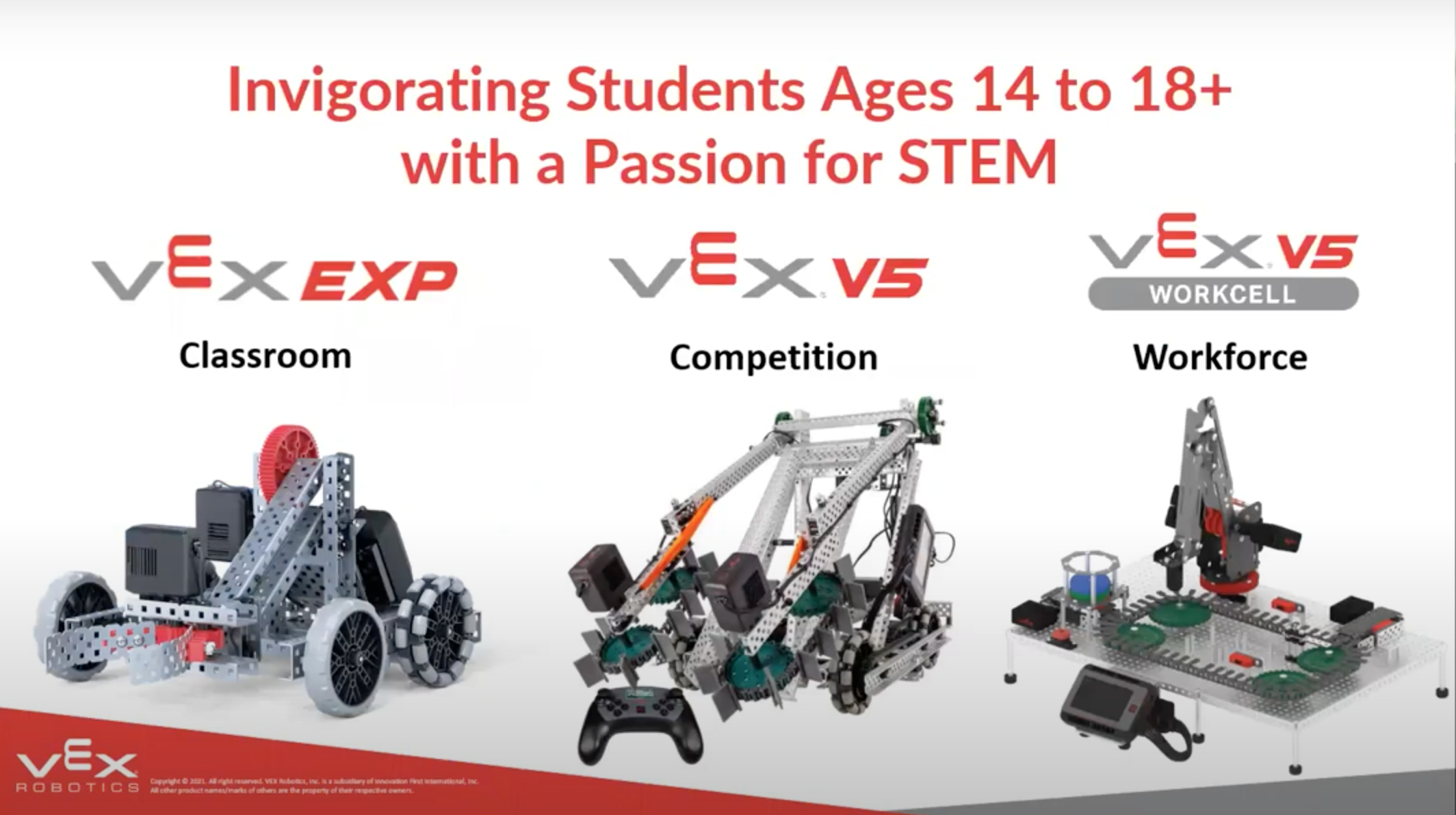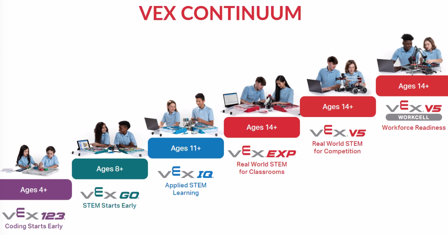 進入高中階段和大學階段,VEX V5 的金屬結構帶領學生踏入更進階的金屬結構競賽殿堂,更靈敏的智慧感測器及更強大的馬達、VEX GPS 感應器,得以進行縝密的得分策略規劃;VEX EXP 則能彌平學生從塑膠結構銜接到金屬結構的學習落差,為機器人學導入教室環境,設計了完善的教學方法與教材;VEX Workcell 為學生敞開真實世界的大門,認識工業用機器人在職場上的應用形式。針對教師端,官網上的資源 VEX PD+ 提供了許多教學成功案例、具有研究背景的教案,以及每個月定期的線上研討會、專屬於教師的互動社群,使教師有在職發展的延續性。