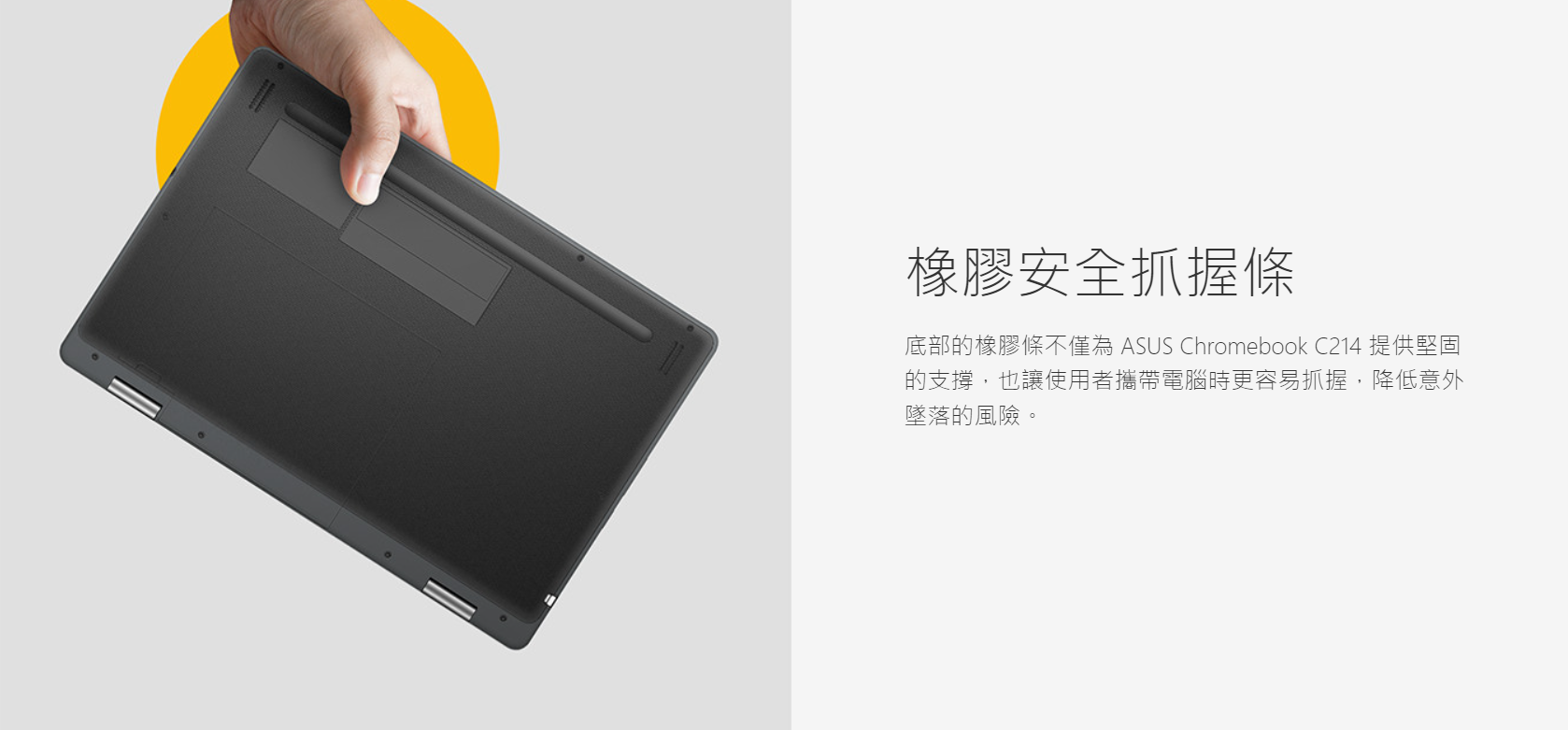 為了支援千變萬化的教學情境,Chromebook C214 配備了多種耐用特性,確保師生使用的便捷與舒適,將可能的損害降到最低。包括全方位橡膠防碰撞邊條設計、底部的橡膠安全抓握條,避免師生遞取載具時不慎滑落,降低撞擊和摔落的傷害。防潑水人體工學鍵盤讓孩子不小心打翻飲料時,仍能順暢使用,壓縮鍵盤周圍的間隙,則使按鍵不容易被撬出而脫落。外殼顆粒狀微凹飾面,更能有效防止刮傷、撞擊凹陷,使外觀在經年累月使用下仍保持無損。