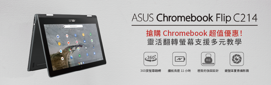 現在就將 Chromebook C214 導入您的校園,克服現實條件限制,防範教室環境不可預期的損壞,讓堅固耐用的載具做您的教學大靠山,用 360 度翻轉螢幕拓展無限想像,以經濟實惠的價格,讓校園得到完善安全的守護。