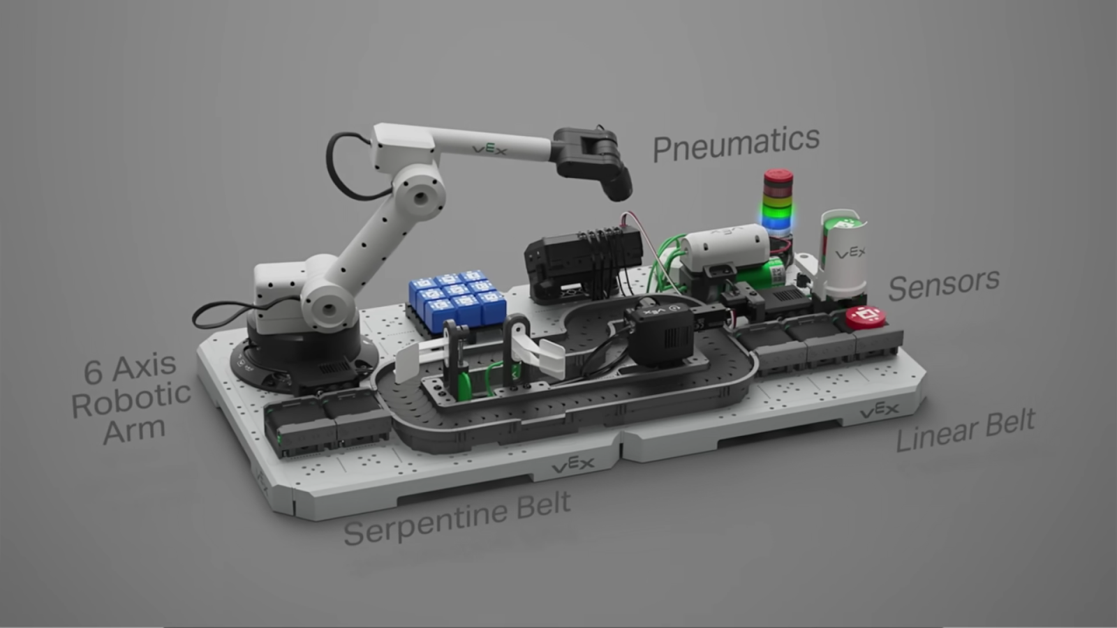全新的VEX CTE Workcell讓您能夠輕鬆地將科技教育帶入教育現場,模擬真實工業情境!CTE Workcell包含六軸機械手臂、輸送帶、氣動系統、感測器、信號塔,您可以透過VEXcode讓機械手臂拾取及放置物品、在內附的白板上寫字。