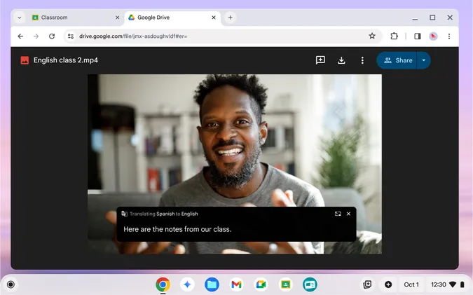 借助「Live Translate」功能,你將能夠幫助學習者以他們的母語或他們正在學習的語言理解內容。「Live Translate」可在媒體串流中啟用 Google AI 翻譯的字幕,支援超過 100 種語言,無論是你發佈到 Classroom 的影片,還是線上研究文章中的影片,皆能適用。