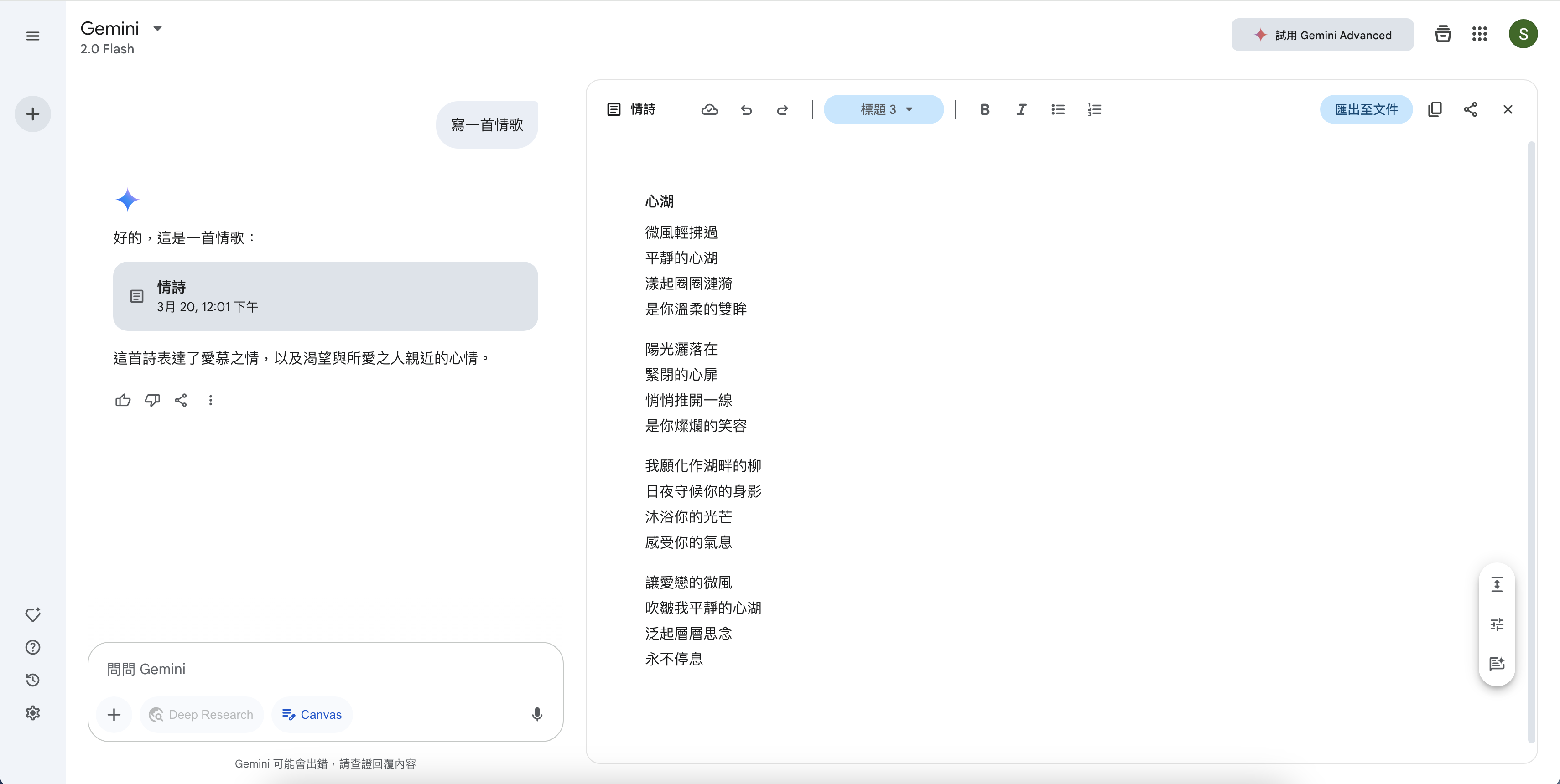 最近 Gemini App( gemini.google.com)釋出新功能—Canvas(教育帳號可能要過一陣子才有),對於想要對 AI 產出的回覆做來回修正,或是利用 AI 撰寫網頁的朋友特別好用。