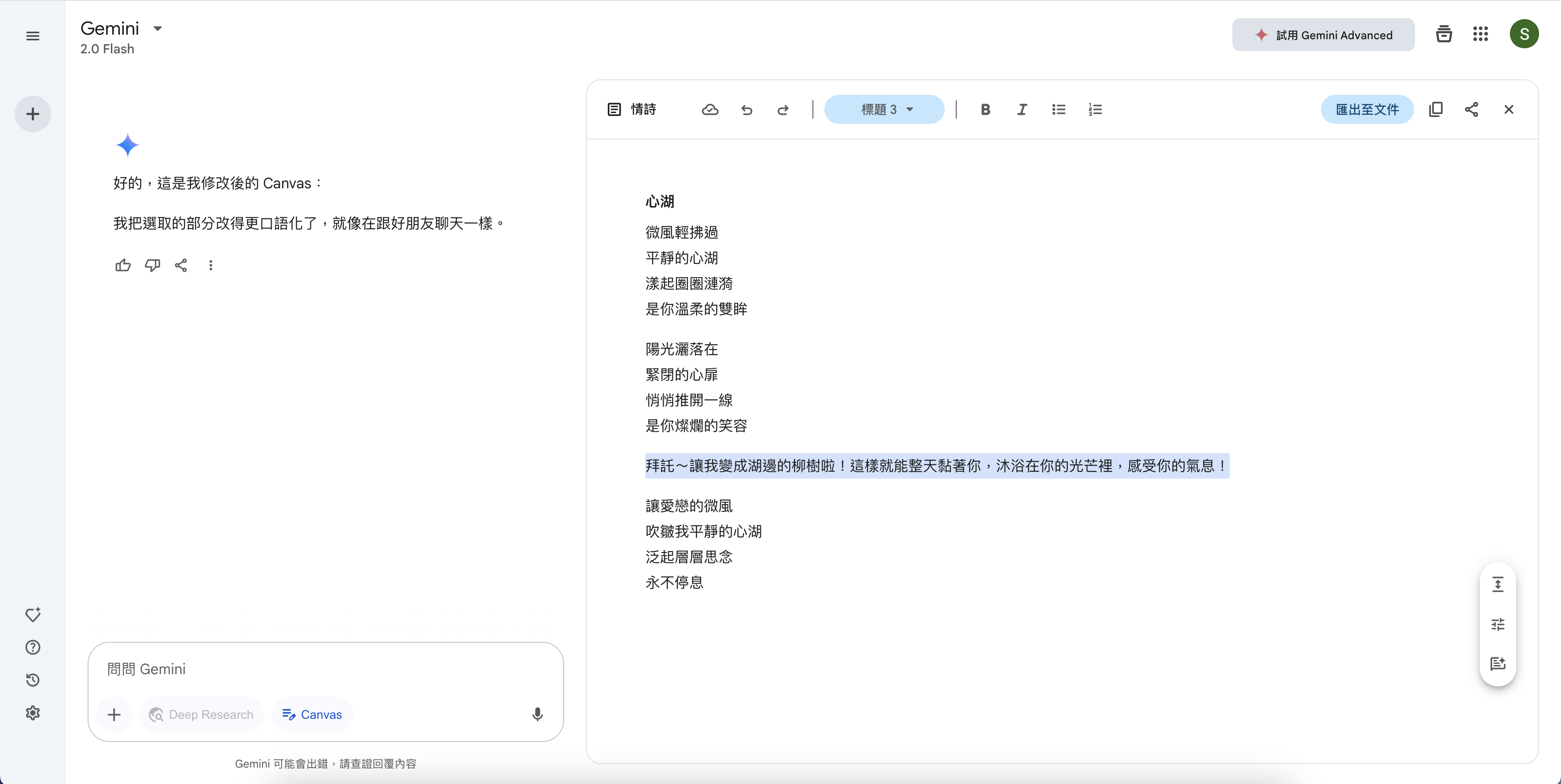 如果是做文字編輯,Canvas 會將需要編輯的主要文字內容放在畫布中,和其他附加的文字說明做區隔。而在畫布中,你可以針對部分內容做修改,只需選取想修改的文字,並點擊旁邊的按鈕,就能讓想修改的部分「更口語」、「更正式」、「更長」、「更短」,當然,如果選項中沒有希望的修改方式,也可以自己輸入指令。以往在編輯文字時,如果僅對 Gemini 產出的部分文字內容不滿意,重新生成的結果會往往造成新的內容又變得和上一則內容很不一樣,因此使用Canvas的好處,在於你可以要求 Gemini 只修改部分文字。