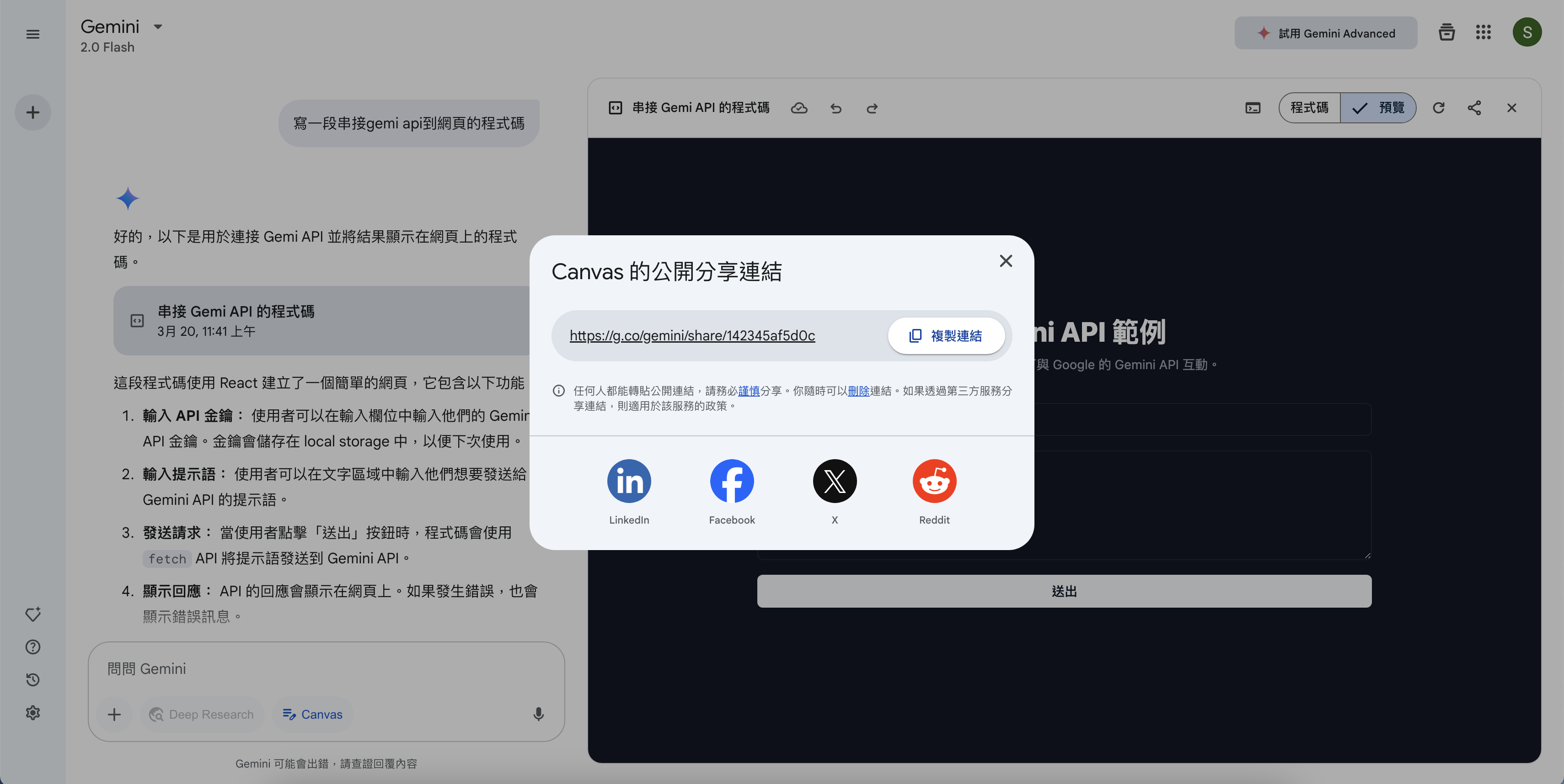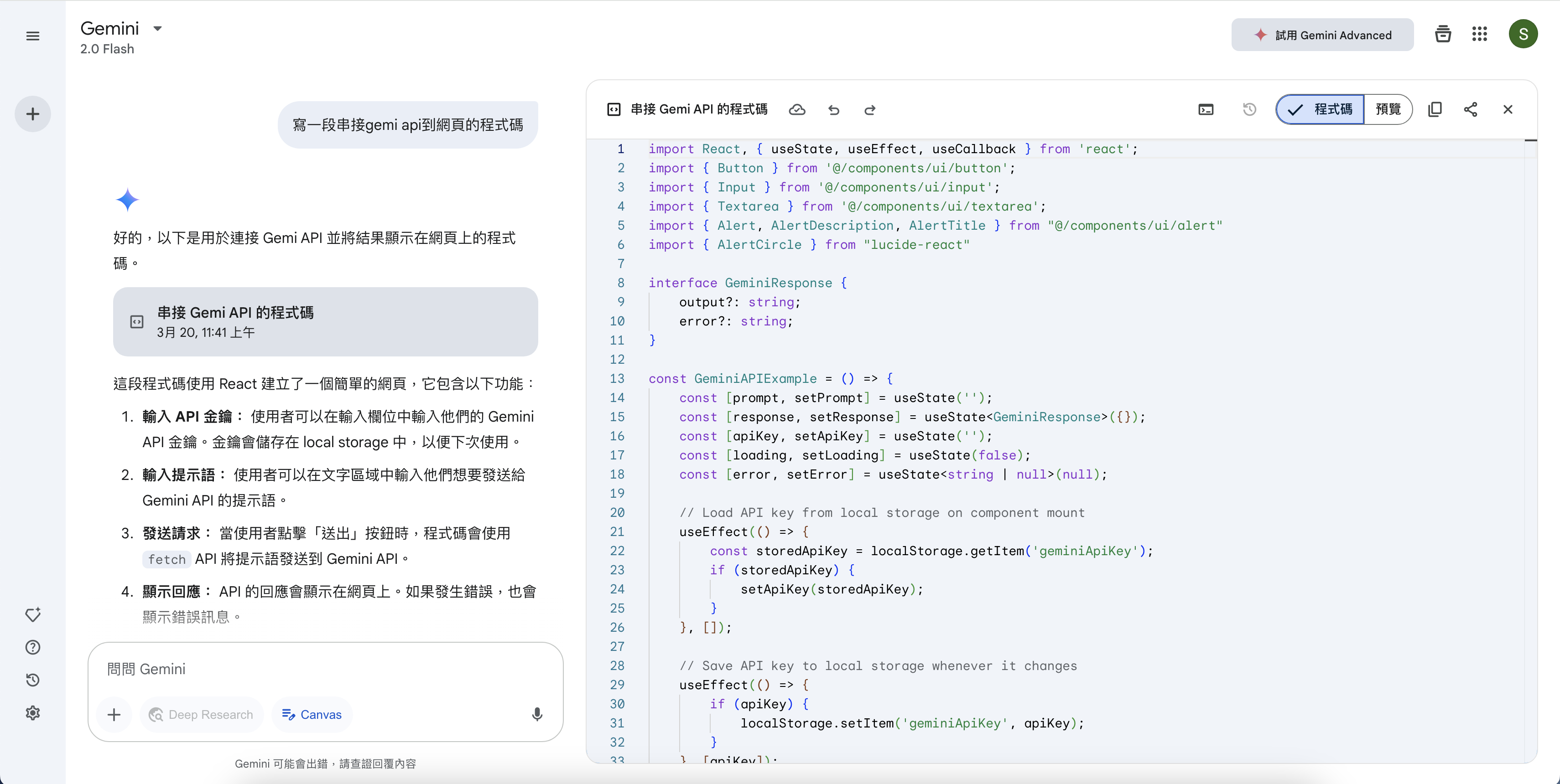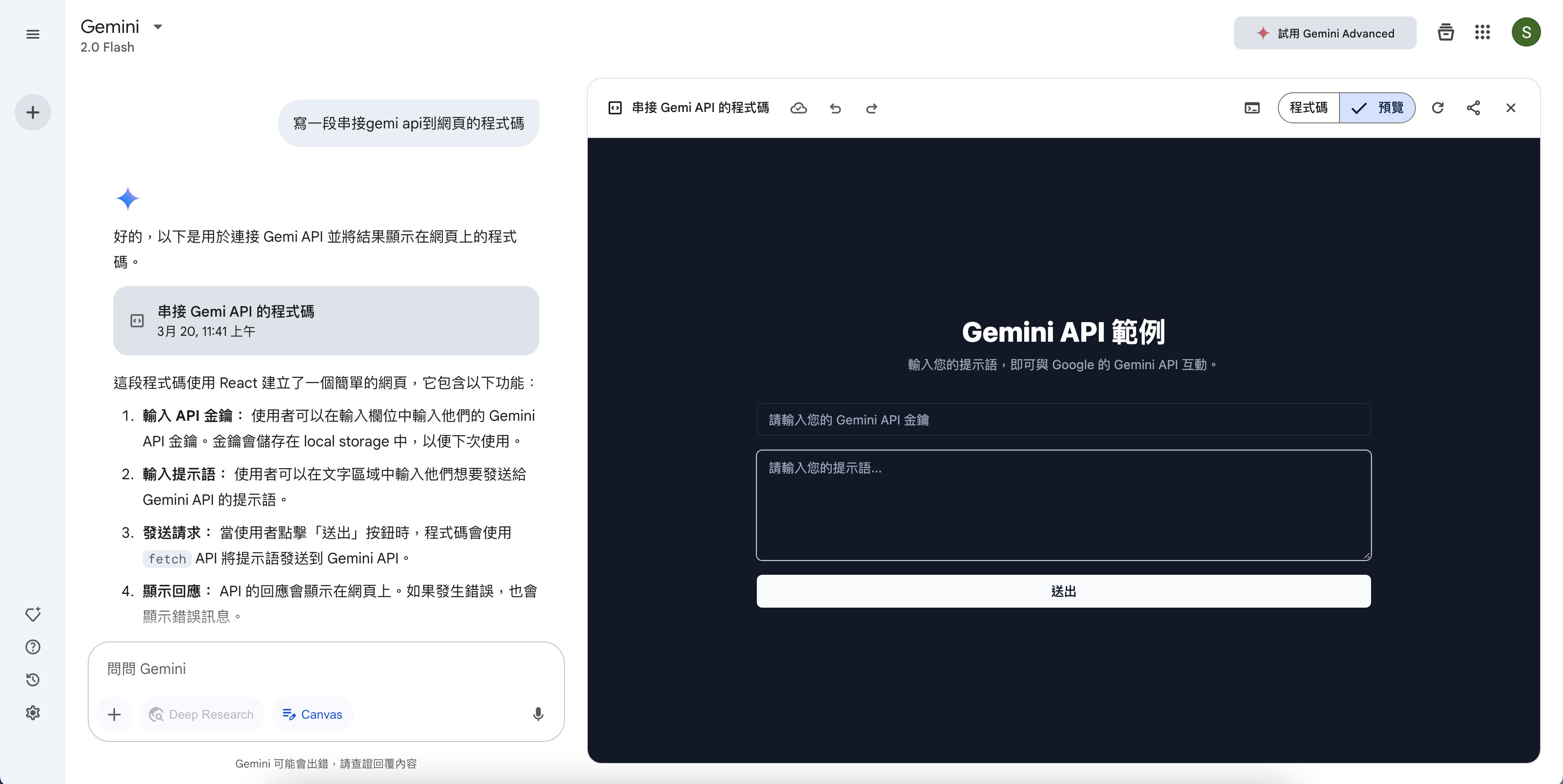 另一個 Canvas 更酷的使用方式,是用來撰寫網頁,並且可以將網頁畫面呈現出來。只需要下類似「寫一個串接 Gemini API 的網頁」、「製作一個教師研習活動的網頁」的指令,Canvas 就會展示程式碼和網頁預覽畫面。而如果要針對部分程式碼做提問或修改,一樣將想修改或提出問題的程式碼選取起來就可以囉!