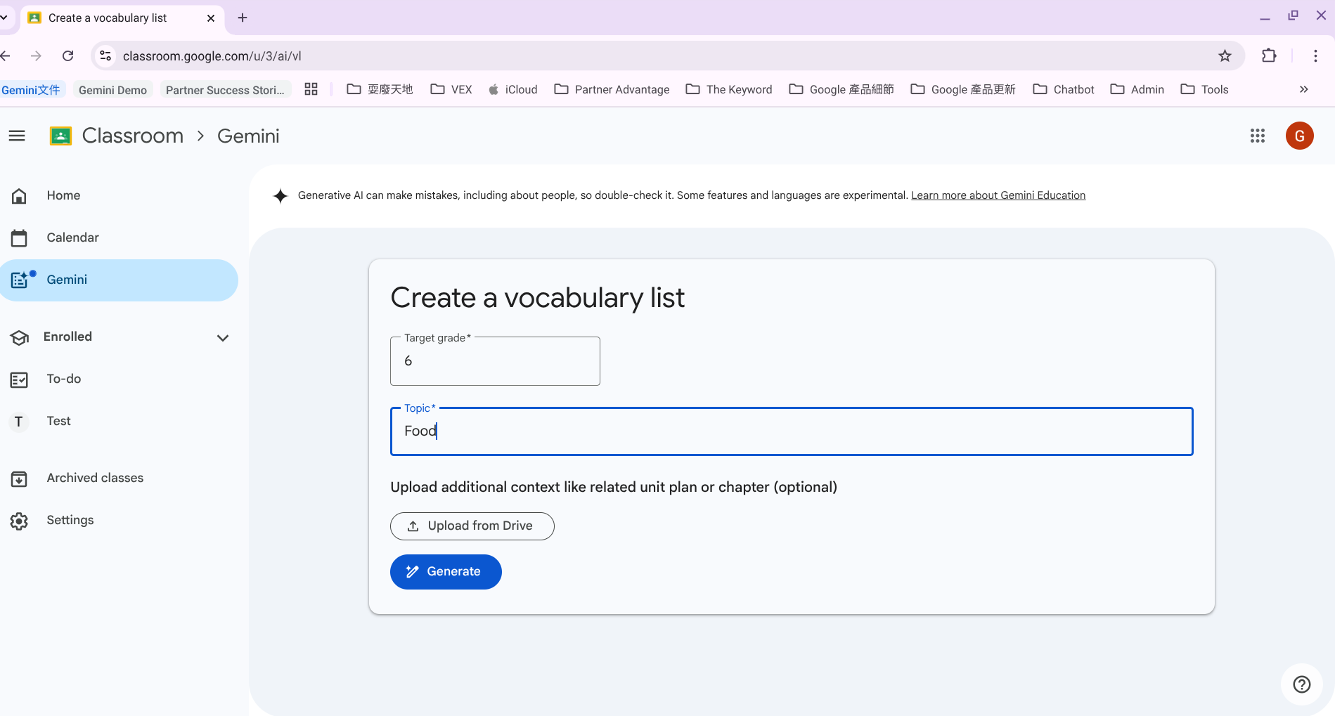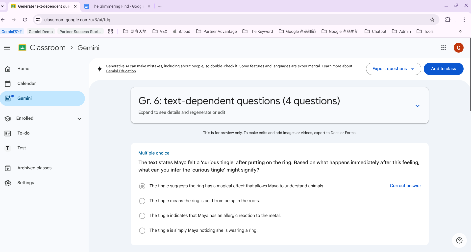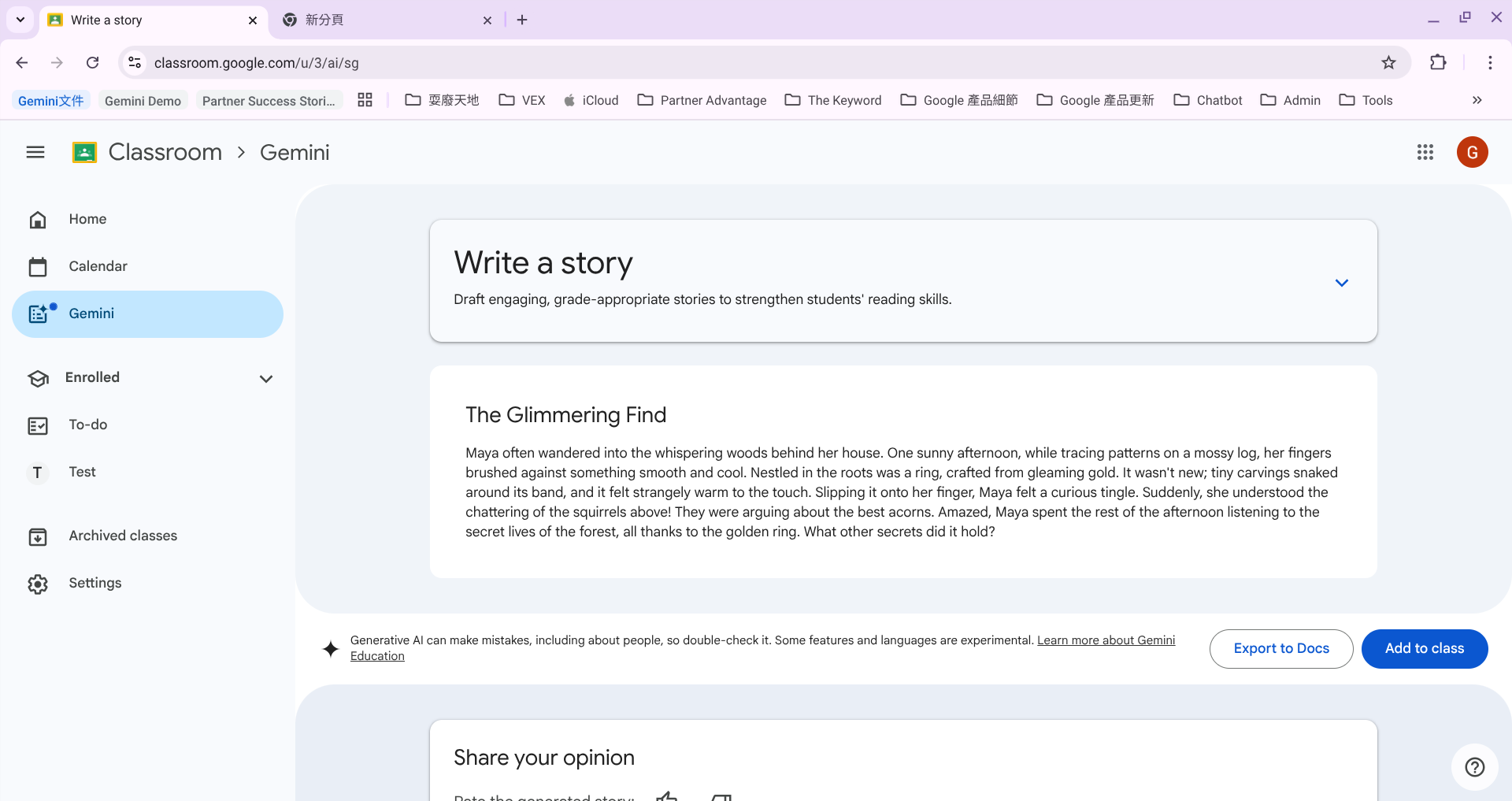 現在 Classroom 中的 Gemini 變得非常多元!不過因為目前 Classroom 中的 Gemini 只能輸入英文指令並生成英文回覆,小編覺得對英文科老師來說更實用。