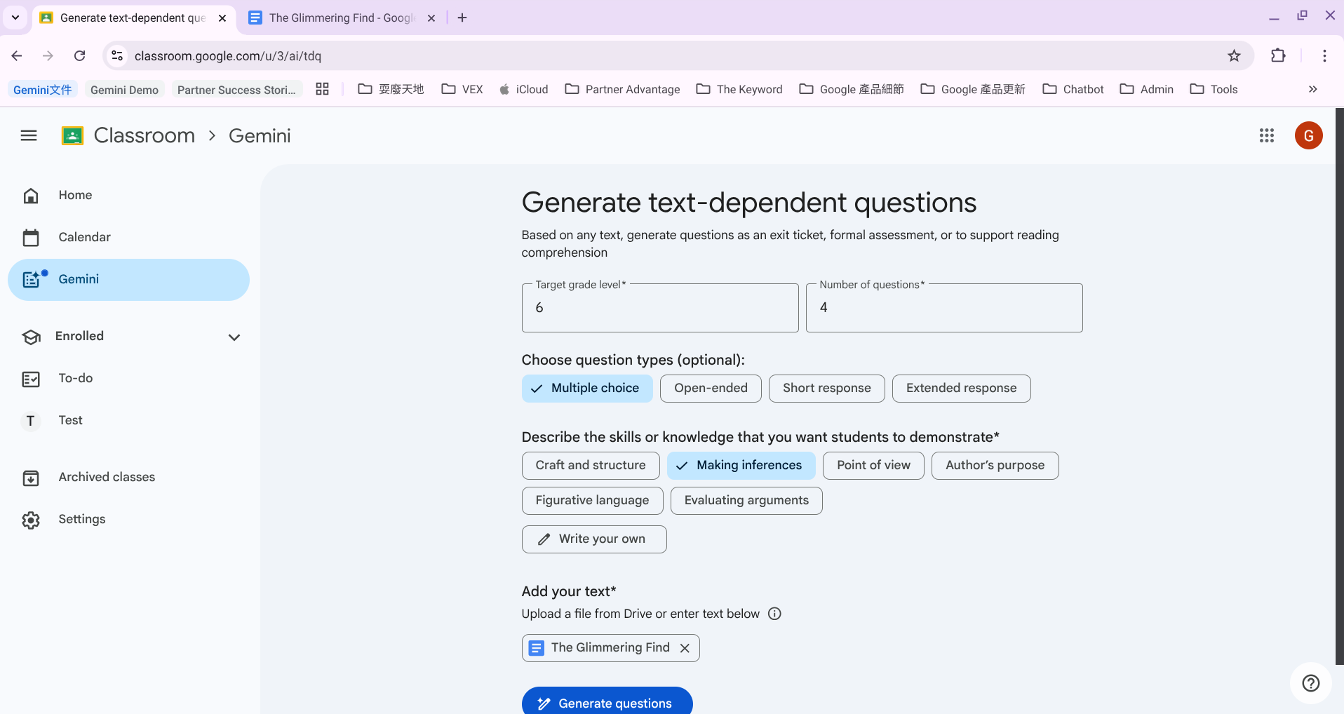 回到先前的頁面,點擊 Generate text-dependent questions 製作閱讀測驗。接著點選適用年級、問題數量、題型、問題取向(例如依照文意做預測、文章觀點分析、文章修辭),最後貼上文章內容或是從雲端硬碟匯入我們剛剛製作好的故事內容。