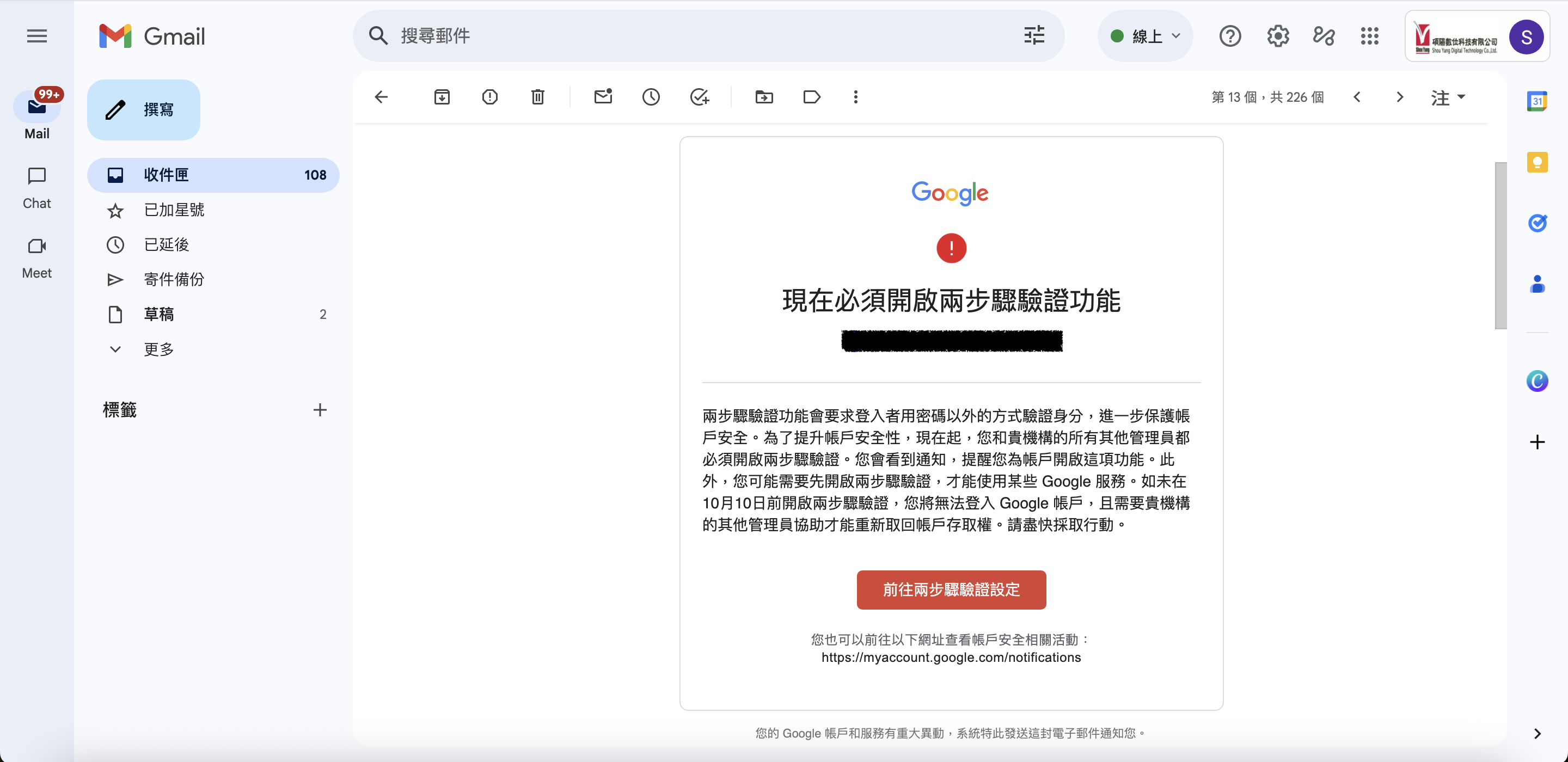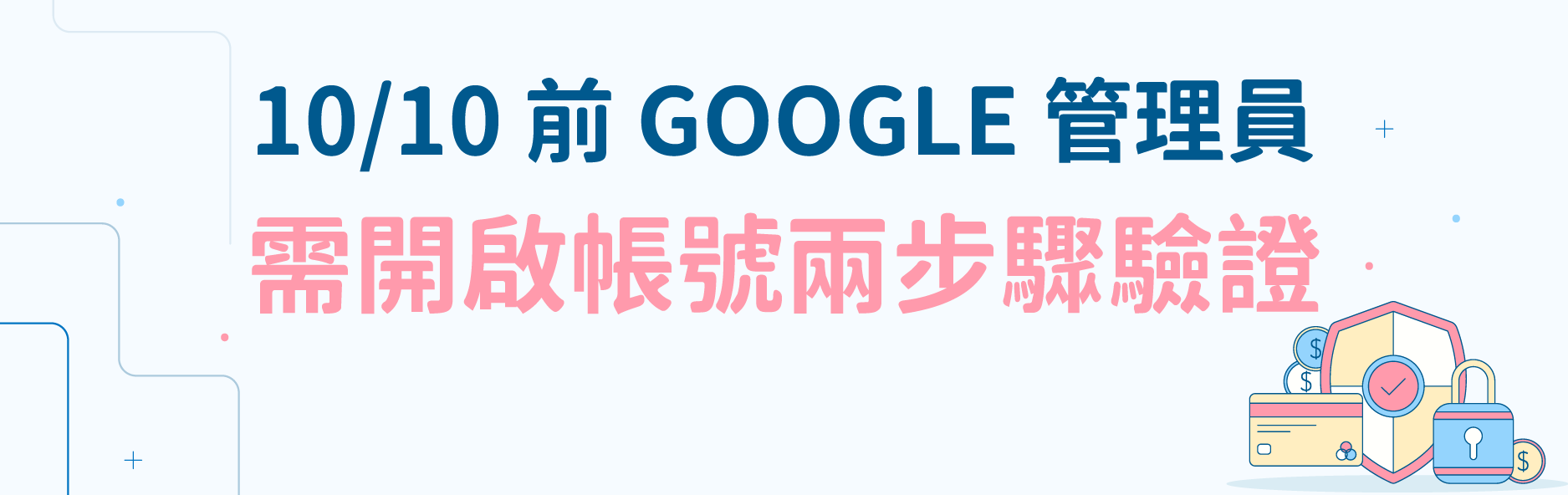 資訊組長們注意囉!學校 Google 管理控制台的管理員最近應該都會收到下圖的 Email 提醒,在 2025 年 10月10日前,各校 Google 管理員都必須開啟兩步驟驗證(只要是有管理員權限的帳號都必須開啟),否則之後會無法登入 Google 帳戶,且需要貴機構的其他管理員協助才能重新取回帳戶存取權喔!