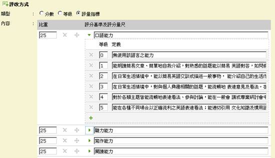 許多老師認為Rubric 是一種「公平、有效率、有回饋」(註一)的評量方式。透過事先和學生討論評分的基準,並透過同儕互評及自評來修正評分基準,最後由老師根據修正後的評分基準來完成評量(註二)。eClass從4.0版後,除了傳統的分數及等級等評分方式外,另外也提供了「評量指標」此一功能,老師可以自定義等級及定義做為評量使用。如下圖,老師參考全民英檢所描述的分級能力,做為定義說明。