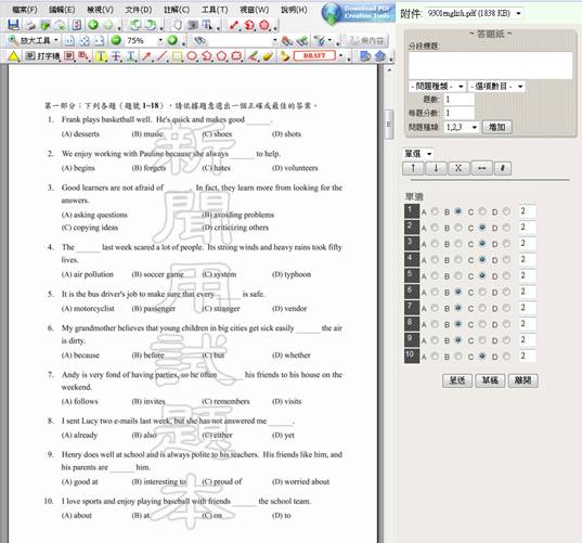 為了解決老師的出題問題,在更強大的方程式模組研發出來前,eClass 4.0採用了答題紙功能,除了解決方程式的問題之外,也讓老師的教學手稿或是以前留存的紙本考卷可以繼續使用。這個功能有點像是使用參加聯考所畫的答案卡。老師把試卷製作或掃瞄成PDF電子檔,在答題紙功能視窗(如下圖)左方呈現,右方則是答題區,老師在此輸入正確答案及給分;學生則在此答題。